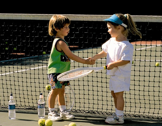 Tennis récréatif . Terrain configuré selon le niveau . Mini-tennis , 3/4 terrain et Plein Terrain . Petits groupes : 4-6 enfants maximum par groupe / instructeur .